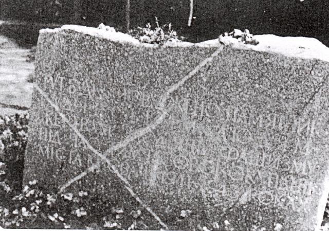 Monument erected in 1966 at Babi Yar. The Ukrainian text reads: "On this site there will be a monument for the victims of fascism (during the German occupation of Kiev, 1941 - 1943."
