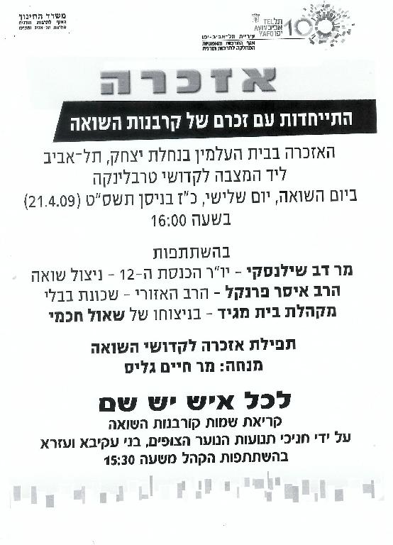 You are kindly invited to participate in the annual Remembrance Assembly ("Azkara") near the Treblinka monument at Nachlat Icchak cemetery in Givataiin Israel, on Yom HaShoah, Holocaust Day - Nisan 27, 5769