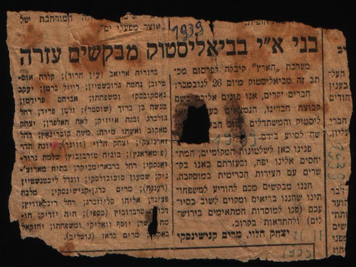 Dear friend, we appeal to you by the name of groups of our friends who are staying in Bialystok and try their best to return to Palestine and ask your urgent help.