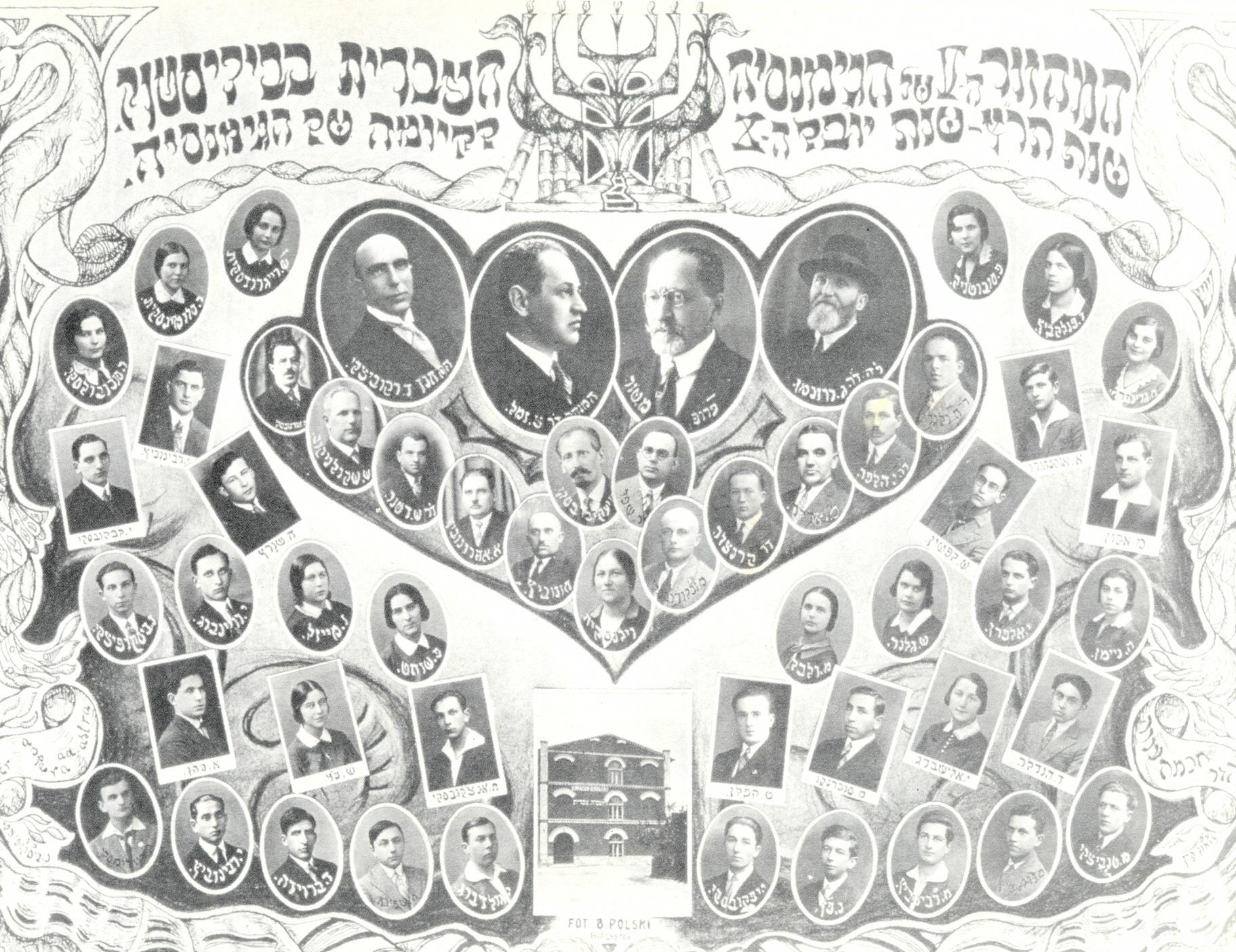 Students, from top, left to right: Sz. Rajglandski, F. Sobotnik, R. Slominski, R. Fanlekewicz, R. Sochowolski, Ch. Grin?, Y. Rabinowicz, A. Okshorn, Y. Lewsowski, Ch. Swarc, Sz. Lipszyc, M. Okun, N. Biskopicki, Y. Sz. Kac, Kleinberg (?), N. Meizel, F. Shochat, M. Welwel, Sz. Gelner, Y. Halpern, H. Najman, A. Kohen, Ch. Anckowcki, T. Kaplan, M. Sukarenko, Y. Aliszberg, D. Hendler, ?radomski, Y. Rabinowicz, D. Broida, Szapira, Goldberg, Yapkowski, N. Kac, Rabinowicz, Perlstein, M. Tanwicki