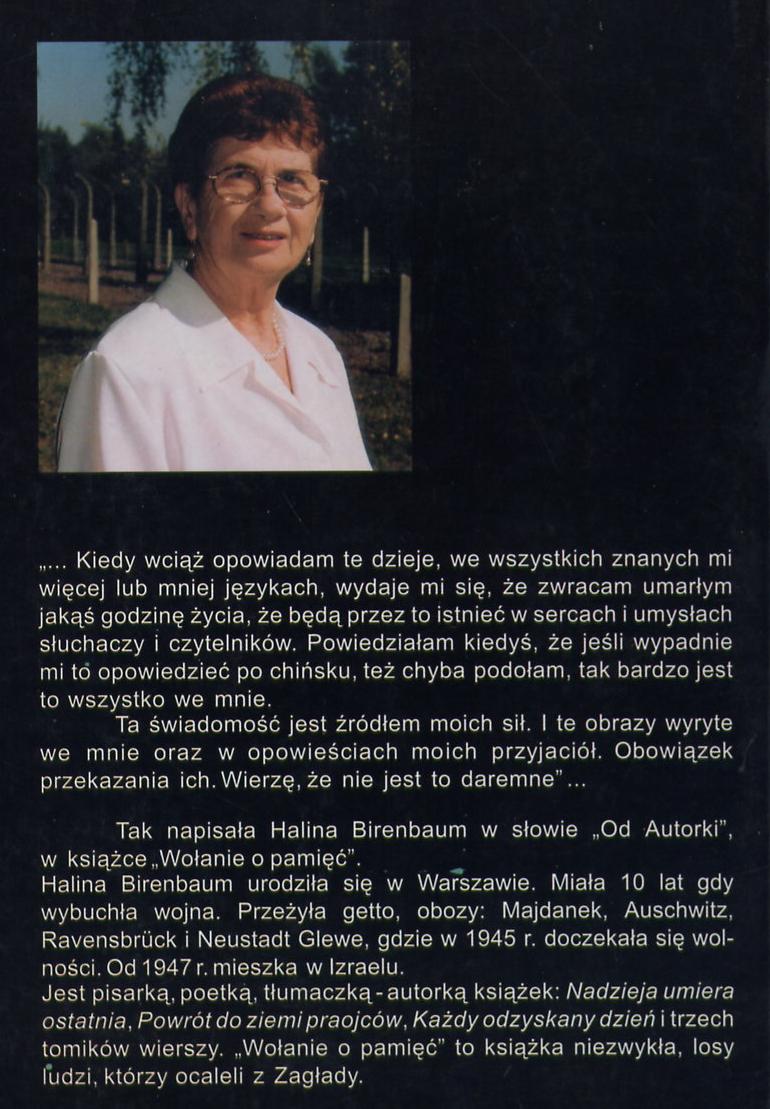 Czyż wtedy ośmieliłabym się marzyć, że wstanę z tych klęczek, że uniosę się nad te druty, kominy – i ujrzę wolność? że przeżyję, okrzepnę – wrócę do normalnego życia? A jednak! Opowiadam, piszę, przekazuję te wspomnienia niezmordowanie, ze wzrastającymi siłami mimo lat, wpajam je następnym pokoleniom. O zwykłych ludziach w niezwykłych sytuacjach i o ich losach. O ludziach, którzy byli i nie ma ich więcej wśród nas - bo zostali zgładzeni.