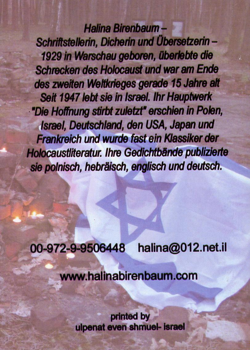 Halina Birenbaum – Schriftstellerin, Dicherin und Übersetzerin – 1929 in Warschau geboren, überlebte die Schrecken des Holocaust und war am Ende des zweiten Weltkrieges gerade 15 Jahre alt Seit 1947 lebt sie in Israel. Ihr Hauptwerk "Die Hoffnung stirbt zuletzt" erschien in Polen, Israel, Deutschland, den USA, Japan und Frankreich und wurde fast ein Klassiker der Holocaustliteratur. Ihre Gedichtbände publizierte sie polnisch, hebräisch, englisch und deutsch.