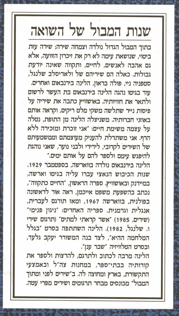אני רואה את עצמי תמיד כילדה קטנה את הילדה שבתוכי אני מרגישה ללא תקנה גם בפתח הזקנה זוכרת אותה, מזדהה בדמותה כל היתר מרחיקה, משכיחה מה גדולה בי אותה ילדה נצחית שמסרבת לשקע בצל השנים והאירועים שרצה אחרי לאורך כל הדרך לא נותנת להתנער, להתבגר קמה מחדש תמיד מתוך העבר העצום ומהעכשוו שבצלו – ומכתיבה אין סוף לסיפורה, אין סוף לסיפורה היא לא תמות לעולם ולא תעלם ממני הילדה הקטנה-הגדולה מהשואה. הלינה בירנבאום 6.10.1985 |