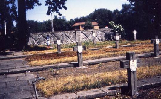 The taxi driver inquired from a local driver about the whereabouts of the estate, Czerwonka, and we found it nearby. The place was fenced and looked big, overgrown with weeds waist high, but no buildings or graves. Finally, our “guide” spotted a building in the distance and walked toward it. It rained. A man came out and our driver asked about the mass graves. The man who was the groundkeeper told us there were graves there but about 2 years earlier the Communist authorities had exhumed the bodies and placed them in the general Catholic cemetery that was nearby. There we saw a few rows of military graves, perhaps as many as 30, with stone crosses on each and a metal sign describing name rank and number of bodies it contained. Where there was no apparent identification, the sign only read: X amount of soldiers and the initials W P (Polish Armies) killed in September of 1939.