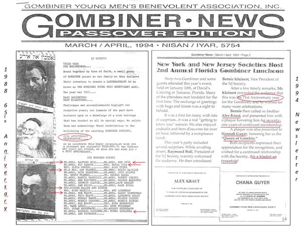 On the right portion of the slide, is the 1994 newsletter reporting on the combined NY/NJ social event which took place in Tamarac Florida. Bernie Kleinert, the NJ vice-president, pointed out in his remarks to the group that this was the 71st anniversary of the society. He then presented a plaque to Alex Kraut honoring him for 71 yrs of service. Also honored, was Chana Guyer, the mother of Bernie Guyer, whose remarkable memory was singled out. Her plaque reads: