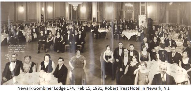 Among the papers I salvaged from my father's place was this delicate picture of an organization called the Newark Gombiner Lodge 174 at a fancy gathering of about 120 people in 1931. Given the name 'Gombiner' obviously this organization has something to do with our Shtetl. But why no mention of it in the Yizkor book? And why did their founders include the word 'Lodge', which is reminiscent of VFW lodges. The lettering on the left side of the image indicates that this event is taking place in the ballroom of the Robert Treat Hotel in downtown Newark - a very expensive venue. Indeed the people in the picture appear to be well off; all the men wearing tuxedos, women dressed in stylish gowns & jewelry and a live band sitting up against the back wall. They seem quite assimilated into American society; I spied no men with beards and only 1 yarmulke is in view.