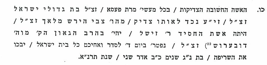 The righteous, important woman; 53 years old; daughter of "one of the great men of Israel", grandson of the Tzadik Cwi Hirsz Malach, wife of R' Ziszel, Hassid. |