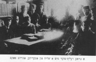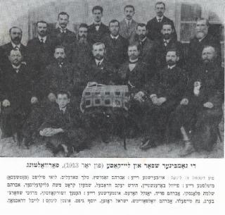 middle row: Fajwel Borenstein, Hirsz Jakob Wrobel, Szmuel Kraut, Mosze Glikzeliger, Abraham Szlomo Plonski, Abraham Fried, Yankel Hodes;