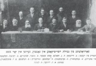 Seated from the right: M. Zeidman, H.N. Zolna, Pinchus Szacher, A Tiber, Szekarka, S. Reifl, delegate from America, S. Borenstein, M. Celemenski, H. Holcman;