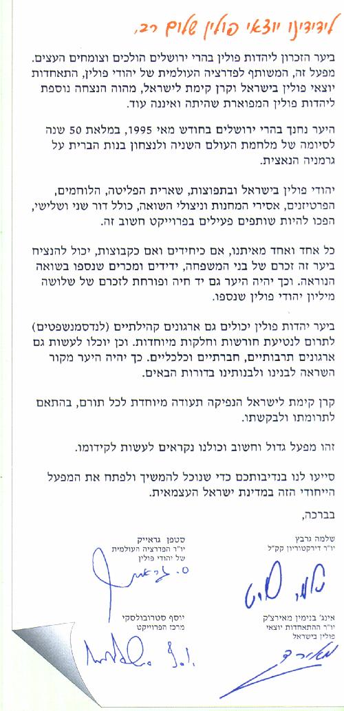 (Letter translated by In the Memorial Forest of Polish Jewry, grow and flourish new trees. This
