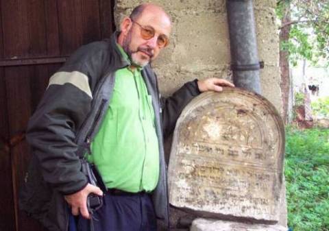 Warren Grynberg with a desecrated Matzevot from the Jewish Cemetery.