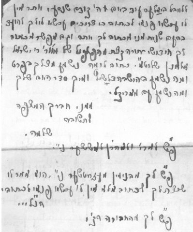 Written by Shlomo, apparently a yeshiva student . It appears that this is the last page of the letter (in Hebrew). Translated by Cheryl Lewin. ".... to Leibl Bialer, on the evening of Thursday before they left. I don't have anymore time to write now as we have to go to class. I'll write more another time and I may also write new interpretations of the Law, some of the argumentation of my teacher R' Yisroel Elchonan - may he live long. Wrire to me what is happening with you, what is happening in the yeshiva at Losice, how is your daily routine, and what is happening with Morikl or Mrs. Rajkel) Your friend who is awaiting your reply. Shlomo. Regards to Arieh and Aharon Losicer; may their light shine. Regards to you from Binyamin Mezritcher; may his light shine. He told me that he wanted to write to you but he had no time to write now. The above mentioned. Regards to you from the holy (?) company. |