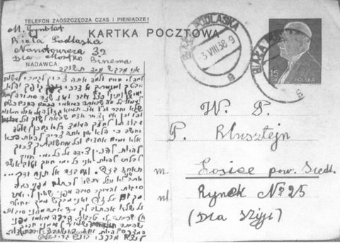 Written by a yeshiva student by the name - Mordechai Bunem (Mortko Binema) Grynblat. Postmark - Biala Podlaska, August 1938, to P. Blusztejn who once lived at #25 Rynek in Losice. Letter is in Hebrew. Translated by Cheryl Lewin.