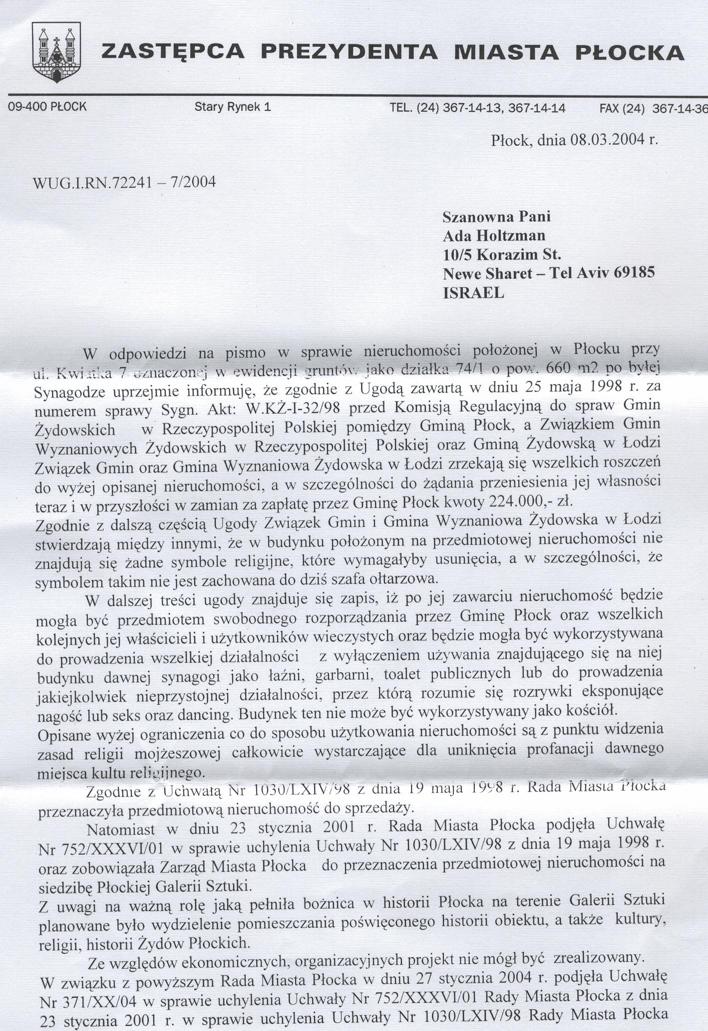 15 years ago I started to explore my family past. Both my parents were born in Gąbin and managed to get to Palestine in July 1939 where they founded Kibbutz Evron in the north of Israel. As my research deepened, I learned how linked was my family to Płock. So I initiated a memorial web site in the Internet: P.R.I. Płock Remembrance Initiative. I did it with some survivors of the Holocaust, Helena Witkowski, Liber Taub, Yeszayahu Livni, Yochewet Braun, Dr. Zofia Pakula and many others. Unfortunately, the message about the restoration of Beth Midrash – Synagogue as a Jewish museum, was too late for them… nearly all deceased… and it was also too late for many many other Jewish Płockers and mainly I refer to more than 10,000 human souls, residents of this town, who were murdered and even their memory fades away by the course of time.