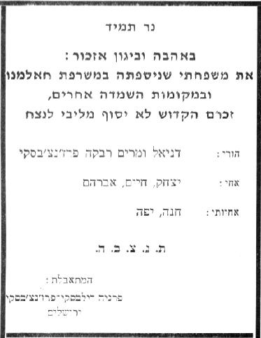 Commemorated by uncle A. Judkowicz, Tel Aviv, 1956. |