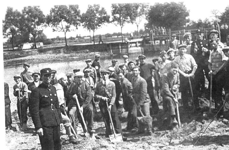 Jews at compulsory labour at the river of Wolborka in Tomaszow - 1940