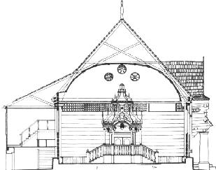 The women's sections were at the west and at the south. The Almemar (Bimah) was placed near the entrance.