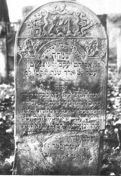 מצבת קבורת בחור נחמד וישר שמחה ב"מ אברהם יעקב ז"ל נו"נ ביום ו' עש"ק יט אדר שנת תרס"ו