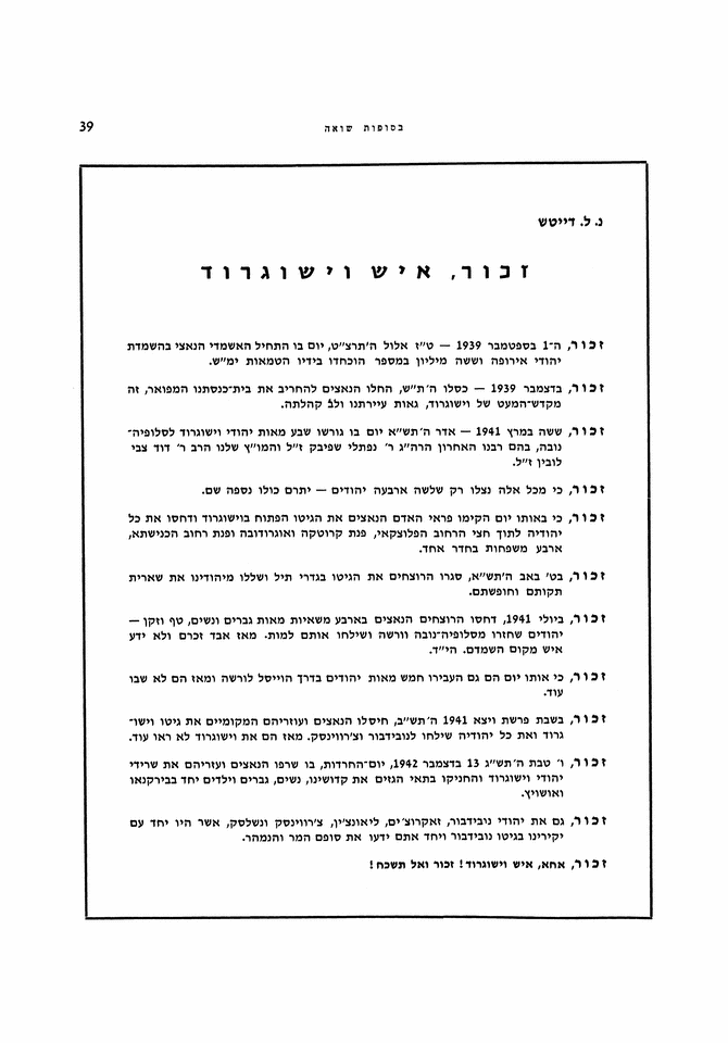 Like in any similar research, connected with a memorial book, the aim is to erect a fitting “tombstone” to the destroyed community, bound to describe in minute detail, as far as possible, its rise and fall, stating the particulars of “born” and “died”; but not “buried”, for the memorial book will make Vishogrod exist in eternity as a spiritual entity, and nobody dare show the place of its burial.