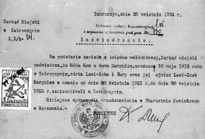 The attached document is a certificate of residence issued to Shoshana Margulis Kohn in 1934 in Zakroczym; probably in order to get emigration authorization. (Click to enlarge it).