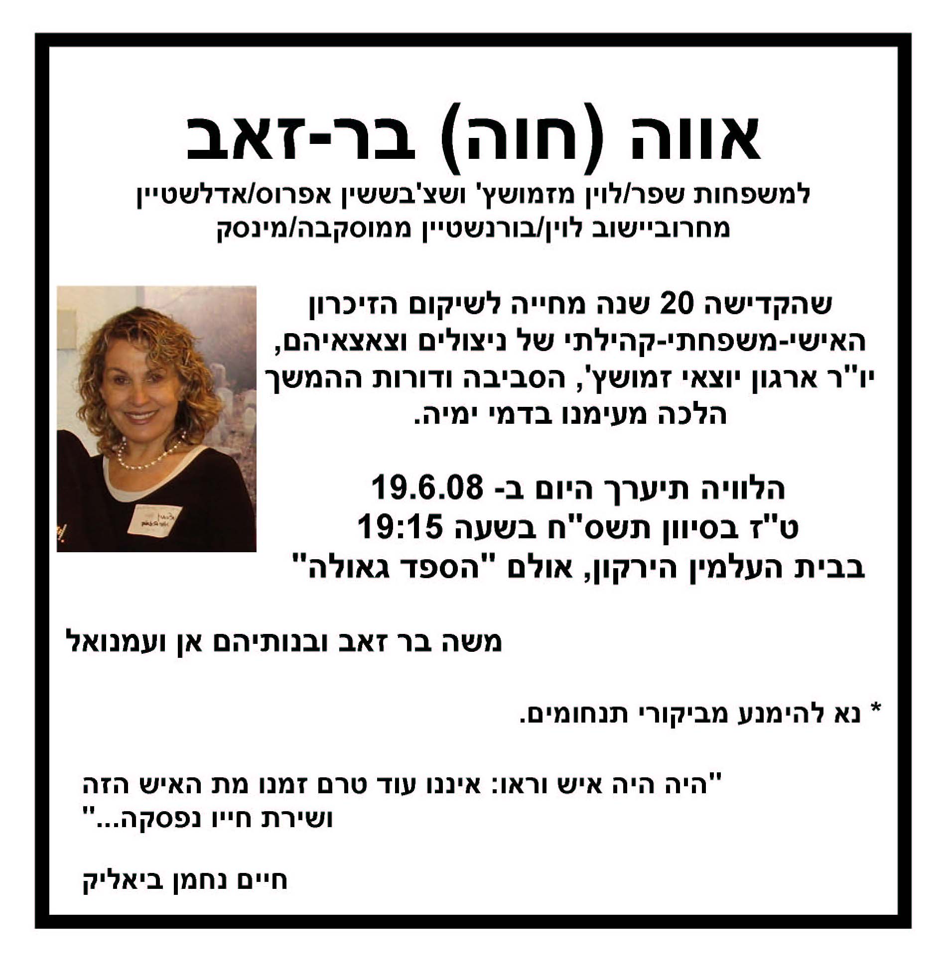 הבוקר הלכה לעולמה אווה בר-זאב ז"ל, יו"ר ארגון יוצאי זמושץ', הסביבה ודור ההמשך.