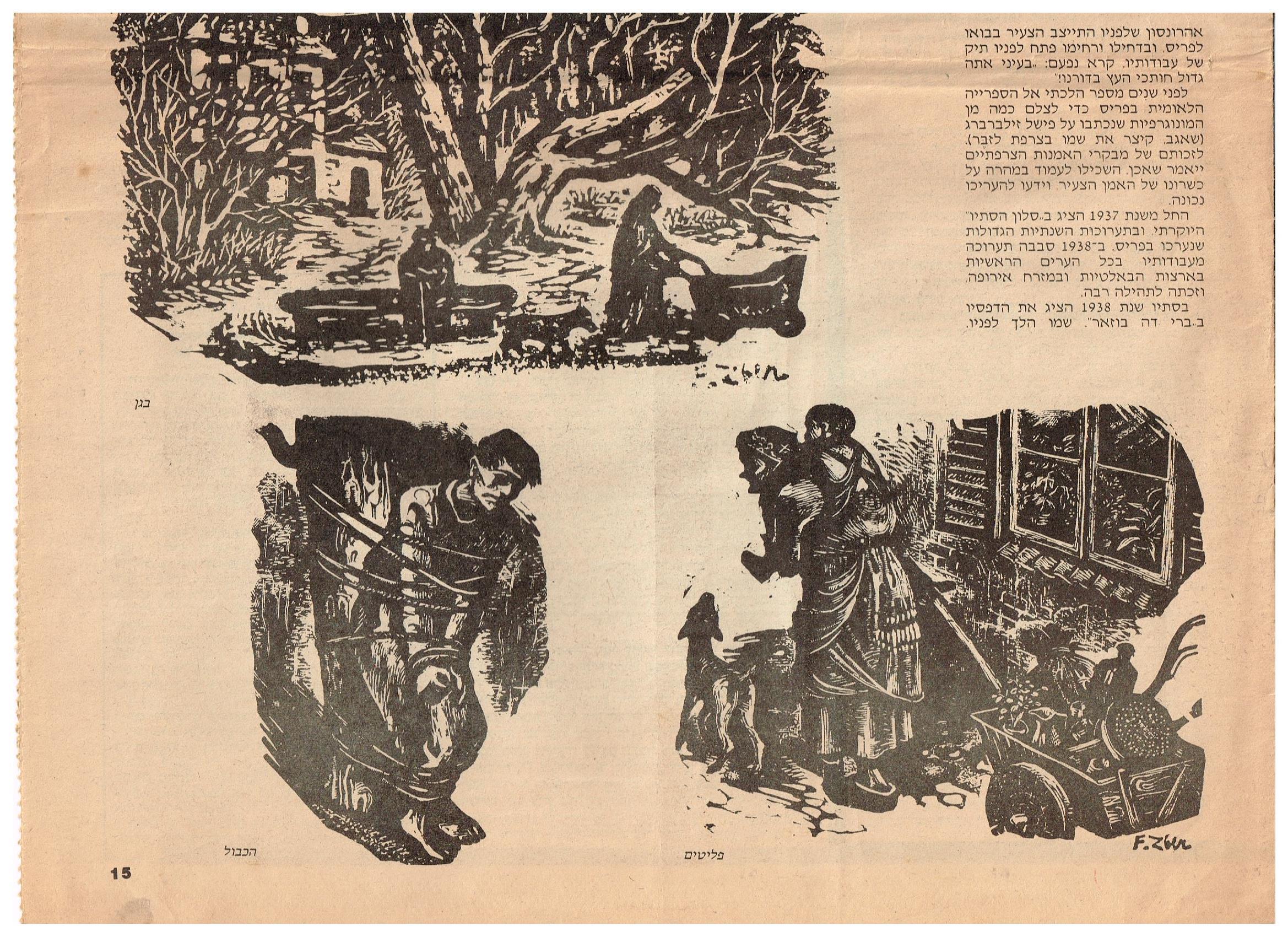 גם כאן בפריס עמדו על כישרונו של פישל זילברברג. מבקר האמנות הצרפתי רב התהילה היהודי אהרונסון, שלפניו התייצב הצעיר בבואו לפריס בדחילו ורחמו, פתח לעיניו תיק של עבודותיו, קרא נפעם "בעיני אתה גדול חותכי העץ בדורנו!"