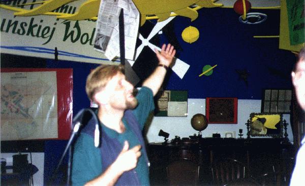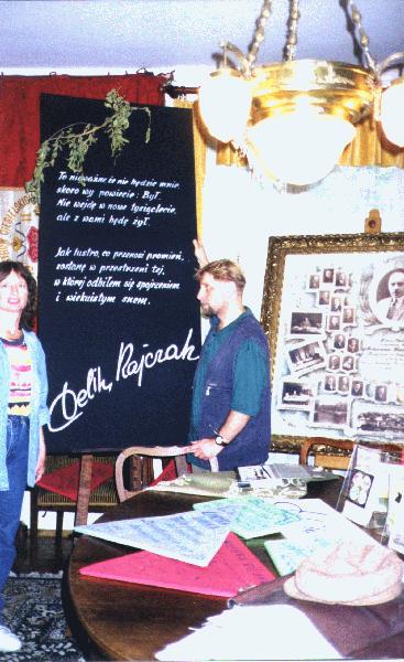 Ada with Jerzy Chrzanowski, the Museum' Manager, near the board with the poem of the deceased poet who inspired him more than anybody: Celik Rajczak from Zdunska Wola.