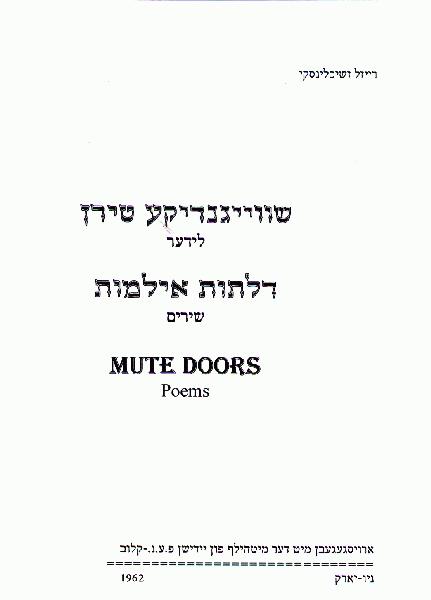 The best I can do is to report that, after opening the "Shweigendike Tiren", the reader will find the kind of great poetry to which one had been used years and years ago, before the era of T.S. Elliot and Ezra Pound and the so called modernists, who, by their cult of unintelligibility, have made a mockery of the esthetic enjoyment of the poetic arts. Rajzel Zychlinska is both simple and intelligible. and as authentic as could be. Reading her lines you get the hang of it at first glance. Subsequently re-reading the verses, you become aware of great depth of feeling As well as of brilliance of imagery. The more you read the more you are tempted to enter Rajzel's world, and an enchanting world it is.
