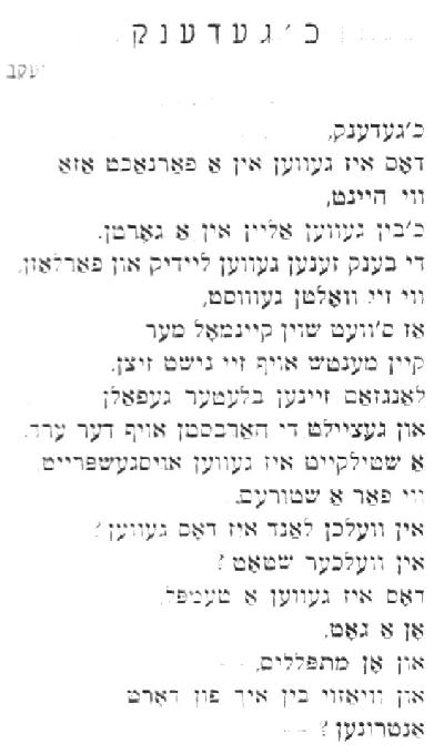 The poem originally published in the Yiddish poems book of Rajzel Zychlinsky: "Shvaygndike Teern" Silent Doors, New York, 1962. (page 94)